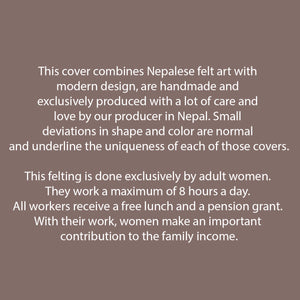 Felt Fox, exclusive felt cover with zipper at the bottom. 100% merino new wool, handmade in Nepal – no child labor! The high quality merino new wool provides natural temparature regulation. Washable cold by hand.